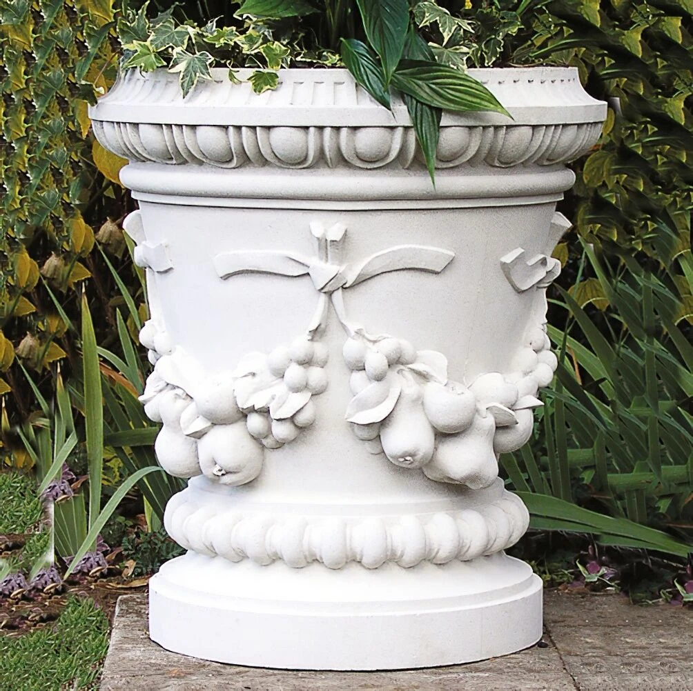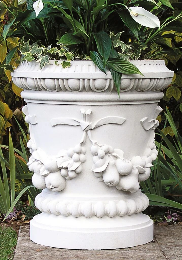 Wavendon Hall zeichnet sich durch ein eindrucksvolles antikes Design aus, welches kunstvoll und stilecht den XXL Vasenkörper ziert. Ein perlenschnurförmiges Band umschließt die Steinamphore, Birnen und Trauben sind liebevoll an Bändern befestigt. Der Rand besticht durch eine reiche Verzierung mit kunstvollen Ornamenten. Aufgrund der großen Gestalt ist das Pflanzgefäß hervorragend für hochwüchsige Gewächse geeignet. Die historische Gartenamphore ist ein Blickfang in jeder Umgebung und lässt Gärten, Verandas sowie Innenräume in antikem Glanz erstrahlen. Nicht nur Gartenliebhaber werden von diesem Pflanzgefäß begeistert sein, auch Liebhaber historischer Amphoren.