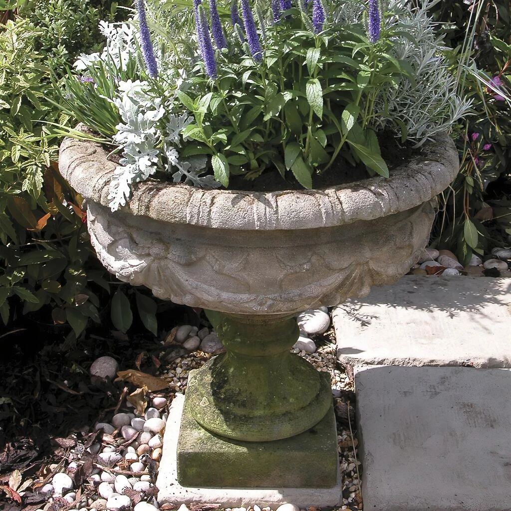 Hübsche Pflanzamphore aus winterfestem Sandsteinguss für den Garten