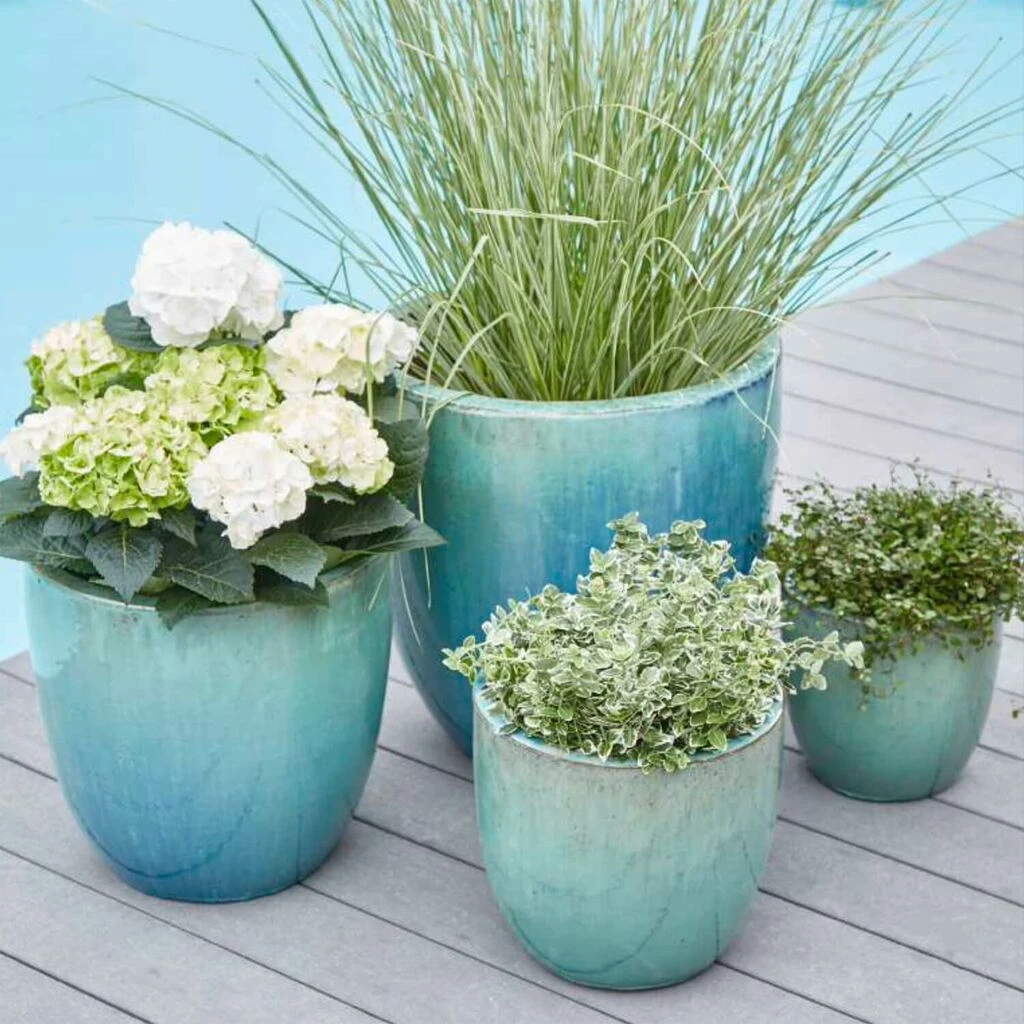 Moderne runde Outdoor Blumenkübel aus glasierter Keramik in Blaugrün. Im Lieferumfang enthalten sind 4 Blumentöpfe mit den Maßen 22x23cm, 27x30cm, 37×38 und 47x47cm (HxDm). Farbliche Abweichungen sind möglich.