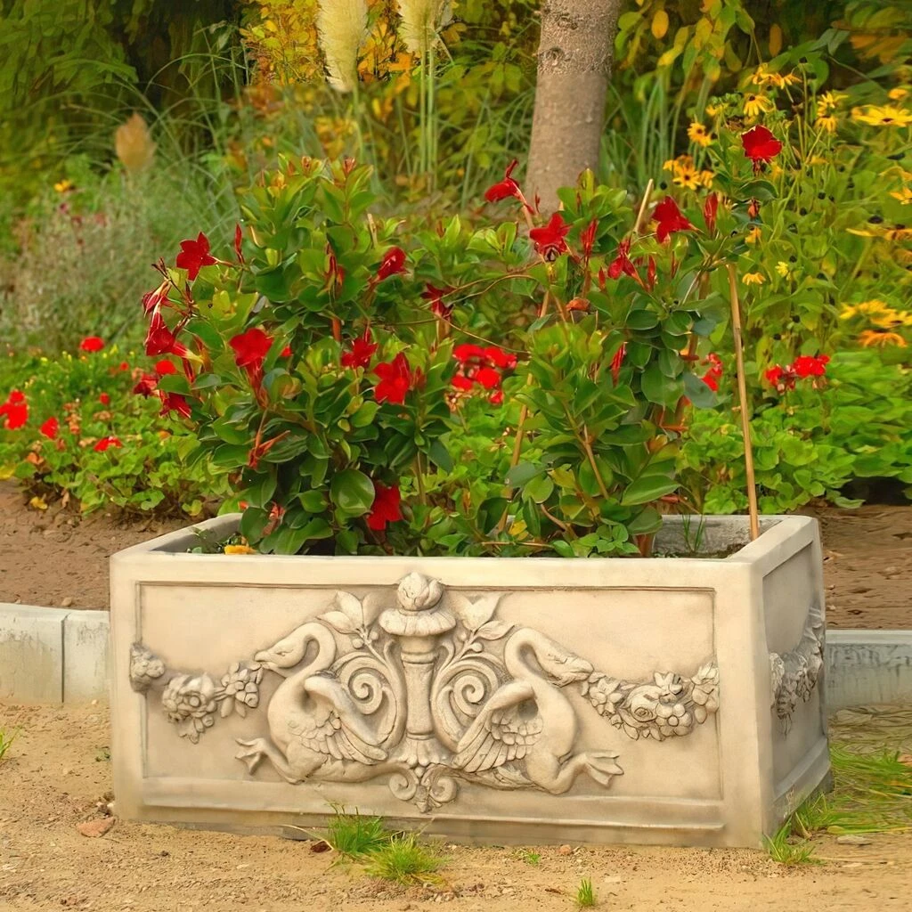 Eckiger Pflanztrog Aus Steinguss Mit Floralem Muster Und Schwänen – Fotia