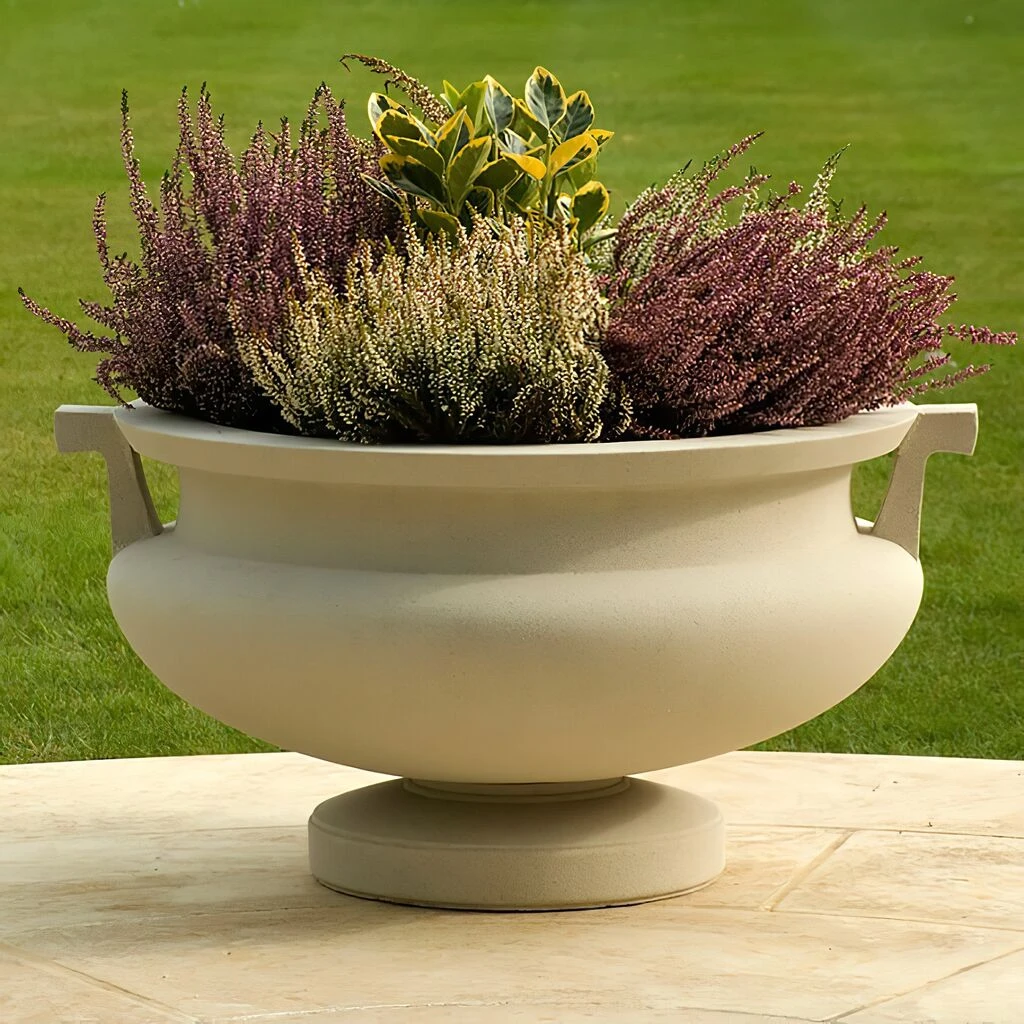 Stilvolle Gartendekoration mit schönen Steinamphoren und Pflanzschalen