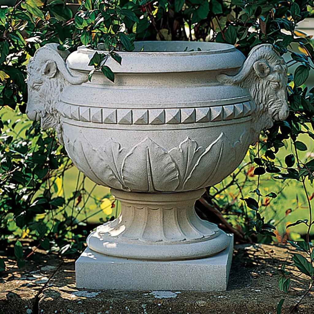 Diese historische Pflanzamphore für den Garten wird in einer traditionsreichen Künstlerwerkstatt in England gefertigt. Bei dem verwendeten Material handelt es sich um einen sehr hochwertigen und witterungsbeständigen Steinguss. Ein besonderer Hingucker sind die zwei seitlich angebrachten Ziegenköpfe. Aber auch das Blätterrelief und die weiteren Verzierungen der Gartenamphore ziehen die Blicke auf sich. Ob als Mauerabschluss oder dekoratives Pflanzgefäß im Garten, dieser wundervolle Pflanzurne wird ihren Standort garantiert bereichern.