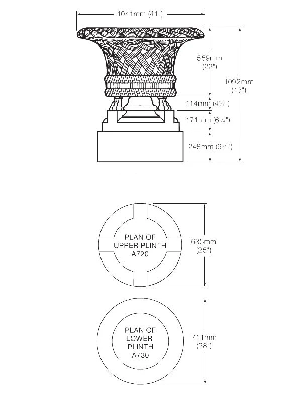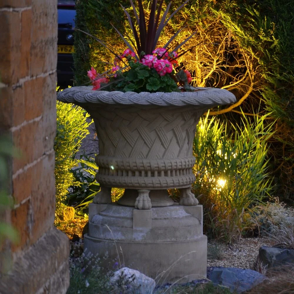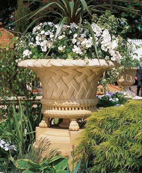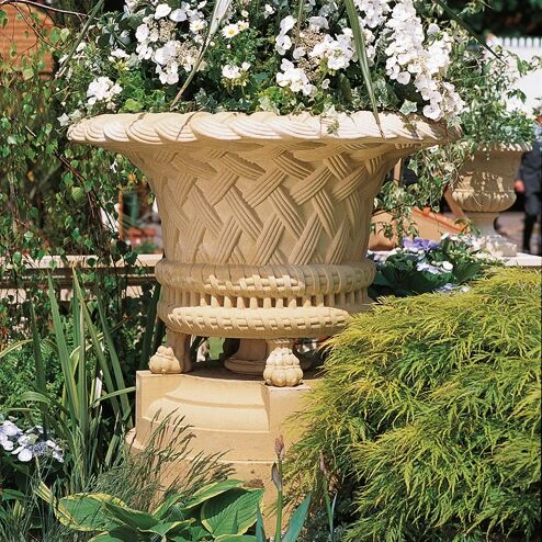 Diese edle Blumenamphore aus hochwertigem englischem Steinguss zeichnet sich durch ihr einzigartiges Design aus. Angelehnt an historische Pflanztöpfe und bekannte Vorlagen aus dem vierzehnten Jahrhundert ist diese imposante Gartenamphore mit einem eleganten Korbmuster verziert. Besonders originell sind die Standfüße dieses Blumentopfes im XXL-Format, sie erinnern uns an die Krallen eines Drachen. Keine Frage, dieses reizvolle Pflanzgefäß zieht Blicke an. Hergestellt wird der große Pflanztrog ausschließlich von erfahrenen Bildhauern und Steinmetzen im bewährten Steinguss Verfahren. Das Material, auch Kunststein genannt, ist frostsicher, witterungsbeständig und sehr langlebig. So kann die Steinamphore auch im Winter im Freien verbleiben uns als Gartendekoration genutzt werden.