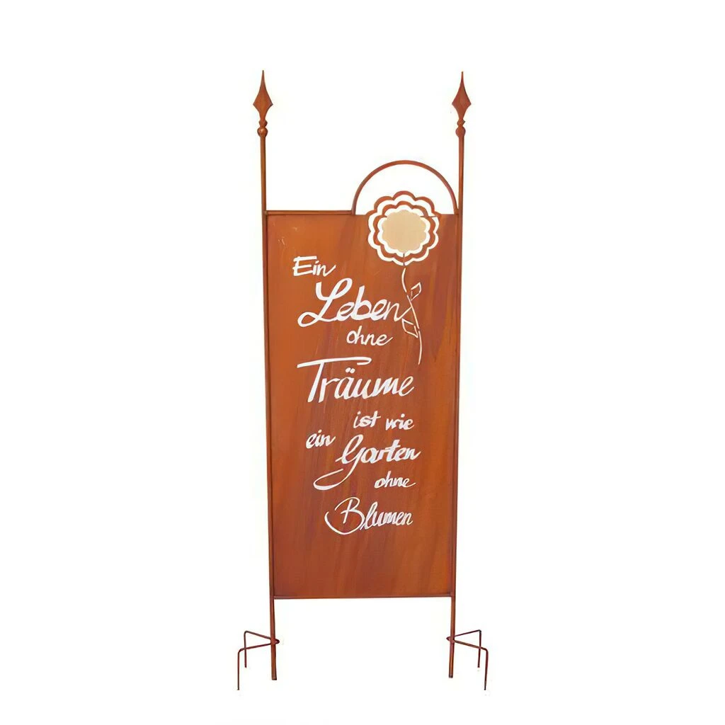 Das Gartenschild FLAVIA wird aus rostigem Metall handgefertigt und ist für die ganzjährige Aufstellung im Freien geeignet. Es besitzt die Inschrift „Ein Leben ohne Träume ist wie ein Garten ohne Blumen“. Mit diesem Rost Schild drücken Sie Ihre Freude am Leben und an einem wunderschönen Blumengarten aus. Über zwei Stäbe, die noch durch extra Häken verstärkt werden, lässt sich das Deko Schild einfach in den Garten stecken. Dank der schönen Rost Patina wird der Deko Stecker ein wahrer Blickfang in Ihrem Blumenbeet.