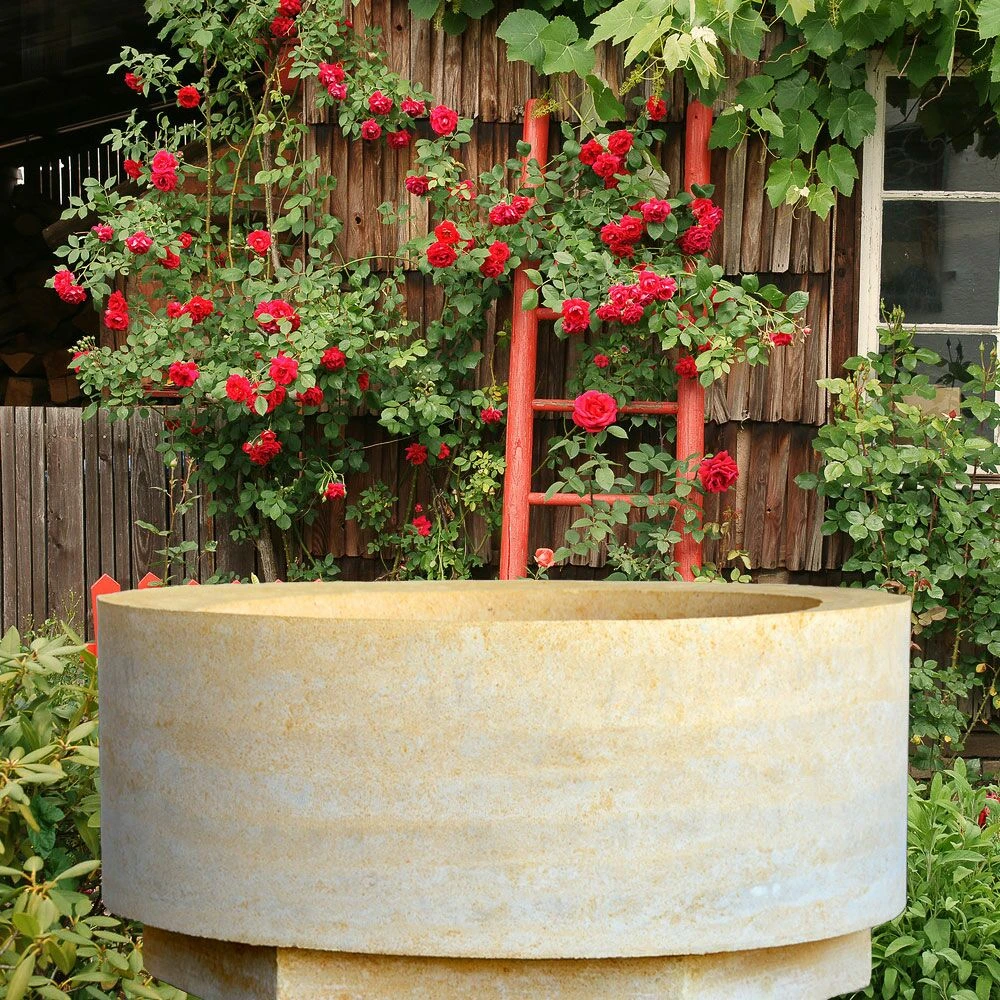 Unsere Blumen Tröge und Pflanzkästen müssen nicht zwingend mit Blühpflanzen bestückt werden – die Steingefäße eignen sich ebenso zum Anbau von Tomaten, Gurken, Erdbeeren oder Kräutern. Unsere Gartengefäße zum Bepflanzen überzeugen durch ihre hohe Qualität und Festigkeit. Da wir beim Fertigungsprozess unserer Pflanzkübel aus Steinguss, Beton oder Naturstein ausschließlich hochwertige Materialien verwenden, sind alle Blumentöpfe und Pflanzgefäße besonders witterungsbeständig und langlebig. Durch ihr Gewicht bestechen unsere hübsch bepflanzten Steintröge auch an windigen und exponierten Gartenplätzen durch ihre Standfestigkeit. Dieser große Beton Pflanzkübel in Sandsteinoptik ist absolut frostsicher und bietet deshalb im Winter – auch ohne Blumenschmuck – eine reizvolle Dekoration in Ihrem Garten. Unsere Steinfiguren und Gartenstatuen mit Pflanzgefäßen und Gartenvasen stilvoll kombiniert, verleihen Ihrem Anwesen ein stimmungsvolles Flair.