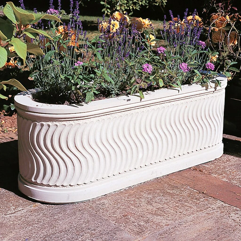 Dieser edle Pflanztopf vereint modernes Design und klassische Eleganz. Als Material verwenden wir einen echten englischen Steinguss, welcher robust und frostsicher ist. Wie alle GARTENTRAUM Dekogefäße wird dieser Blumenkasten im XXL-Format ausschließlich in klassischer Handarbeit gefertigt. Aber auch optisch hat dieser stilvolle Pflanztrog einiges zu bieten: Die ovale Form und die filigranen S-förmigen Mustern machen diesen großen Blumentopf zu einem außergewöhnlichen Blickfang. Bei der Farbwahl orientieren wir uns ganz an der Natur. Wählen Sie auch verschiedenen edlen Erdtönen oder einem schlichten weiß. Dieser hochwertige Blumentrog eignet sich für Garten, Terrasse und Innenhof, sowie, um einzelne Bereiche im Freien optisch voneinander abzutrennen.