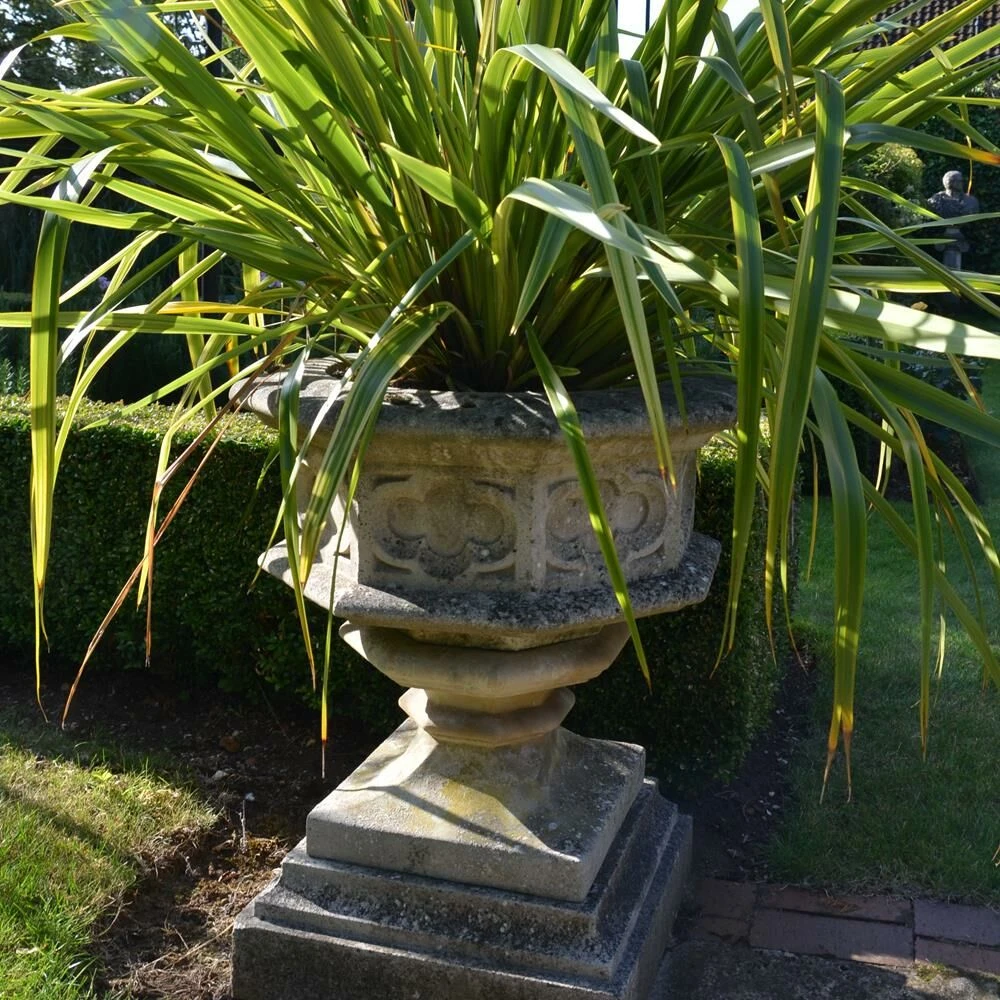 Brickhill Manor ist eine imposante historische Gartenamphore aus Stein, welche auch großen Pflanzen ein geräumiges Zuhause gibt. Der runde massive Körper wird von einem kunstvoll verarbeiteten Schaft getragen, welcher auf einem quadratischen Sockel steht. Die Blumenvase wird durch ein geripptes Netzmuster verziert, welches nach unten von einem Kordelband abgelöst wird. Der Gefäßrand des Steintroges ragt dekorativ in die Umgebung. Aufgrund der Form eignet sich das Gartengefäß nicht nur als Pflanzvase, auch als Vogelbad und Wasserbecken in Kombination mit einem Brunnen oder frei stehend auf einer Grün- oder Kiesfläche wirkt das Dekogefäß als toller Blickfang. Brickhill Manor bildet somit ein ausdrucksstarkes Dekorationsmittel für jede Umgebung.
