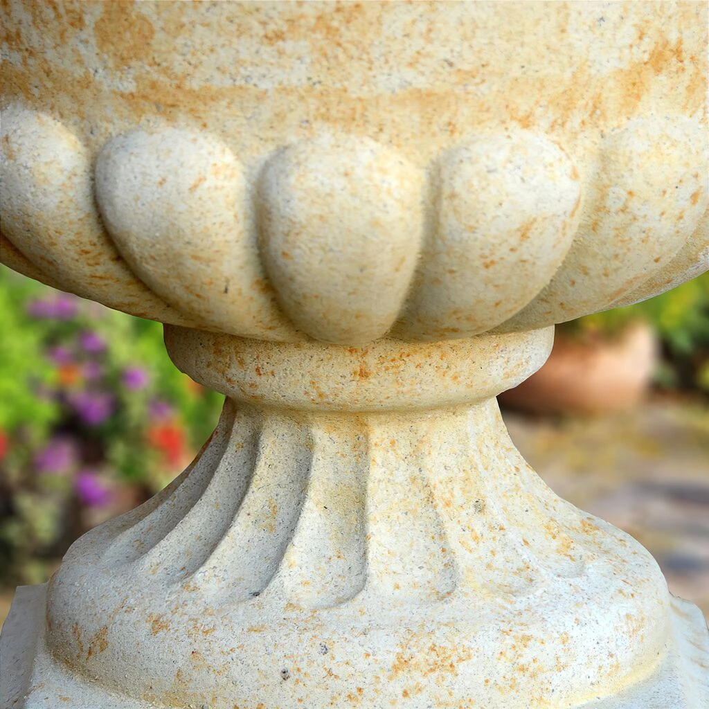 Eine elegante Gartenvase aus historischen Zeiten bringt Glanz in jede Umgebung. Die besondere Form der Steinamphore sorgt für eine Harmonisierung mit der umgebenden Pflanzenpracht. Schwungvoll nach oben öffnend bildet das Pflanzgefäß einen runden Blütenkelch, mit gleichmäßiger Verteilung der Blütenblätter. Die Gartenamphore steht auf einem quadratischen Sockel, wodurch ein fester Stand gewährleistet ist. Die Steinvase lädt Blumen nahezu ein, sich in ihr anzusiedeln und im Einklang mit der Natur zu sprießen. Aber auch ohne Bepflanzung bildet die historische Gartenamphore ein Highlight auf Grünflächen, der Veranda oder im Haus. Sie stellt eine Bereicherung für jeden Ruheort dar, indem sie Frieden und Einigkeit verströmt.