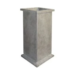 Die hohe Gartenvase ist aus Stahl wetterfest modelliert. Bänderförmige Muster verleihen dem Pflanzgefäß ein einzigartiges Erscheinungsbild.