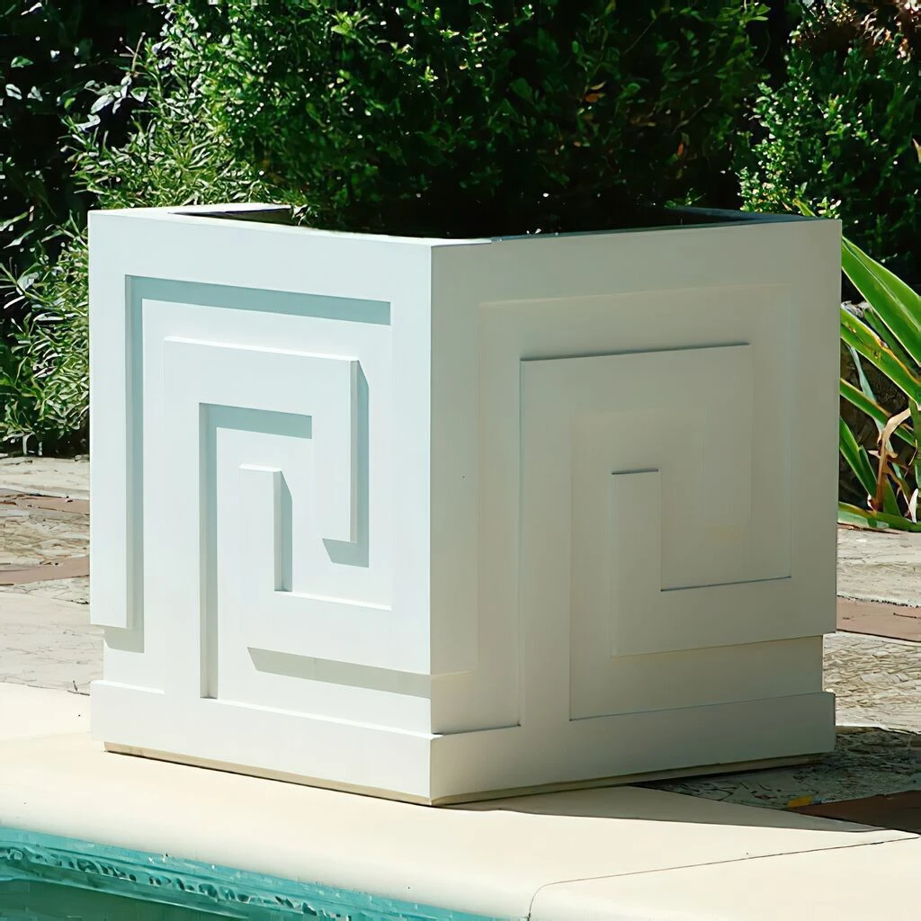 Dieser schön gearbeitete Pflanztopf aus englischem Steinguss eignet sich für Draußen, sowie für den Innenbereich. Auf Grund des hohen Gewichts ist dieses Pflanzgefäß sehr standfest, der Stein ist zudem frostfest und witterungsbeständig, so dass er das ganze Jahr im Freien stehen kann. So müssen Sie sich nie wieder über beschädigte Pflanzen ärgern, diesen Pflanztopf weht kein Sturm um. Der Pflanztrog wird in bester Qualität von Hand bei unseren Fachpartnern in England hergestellt. Wir bieten ausschließlich Pflanztöpfe und Amphoren aus hochwertigen Materialien, so dass Sie viele Jahre Freude an Ihrer Gartendekoration haben werden. Auch beim Design gehen wir keine Kompromisse ein: Das elegante Pflanzgefäß wurde exklusiv von Künstlern und Bildhauern entworfen. Der zeitgenössische quadratische Pflanztopf ist verziert mit modernen architektonischen Linien im Mäander-Stil.