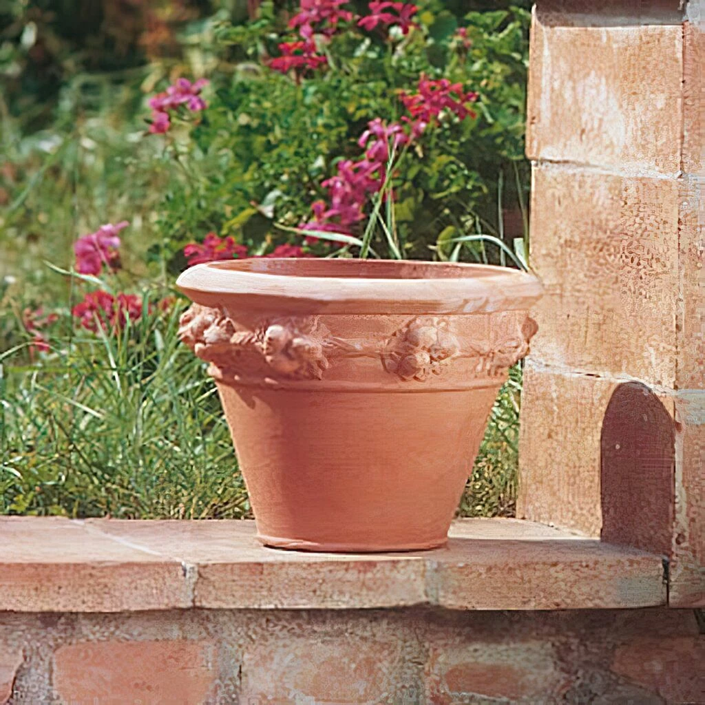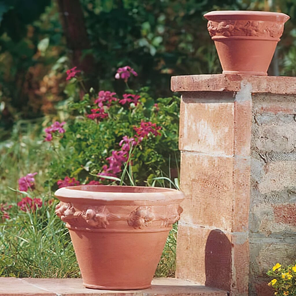 Bereits in der Antike und der Renaissance stellte Terrakotta ein beliebtes, leicht zu bearbeitendes Material dar, um Skulpturen, Vasen und Säulen stilvoll und gleichzeitig robust herzustellen. Für die Verarbeitung wird ein spezielles, eisenhaltiges Tongemisch verwendet, welches den Pflanztöpfen einen einzigartigen warmen, roten Farbton mit Nuancen verleiht. Für dieses Pflanzgefäß wird Impruneta-Terracotta verwendet, mit einem besonders hohen Anteil an Kuper-, Eisen- sowie Aluminiumoxiden. Nachdem das Steingut abgebaut und gekocht wurde, wird das Material zu einem Blumentopf geformt, welcher in liebevoller Handarbeit Verzierungen erhält. Nach der Modellierung erfolgt der Brennprozess im traditionellen Holzofen bei 960°C. Die für Terrakotta übliche Brenntemperatur liegt somit bei dieser speziellen Sorte höher. Im Gegensatz zu klassischem Ton erhält dieser Naturstoff keine Glasur am Ende der Bearbeitung. Passend zu dem Pflanzgefäß finden Sie bei uns Podeste und Skulpturen aus Terrakotta.