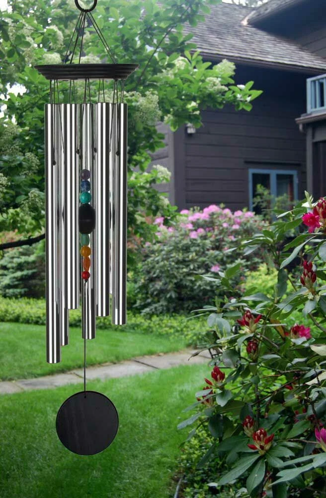 Auch dieses große Windspiel mit Metall Röhren ist nach den Frequenzen der Chakren gestimmt. Die sieben großen Steine symbolisieren die Chakren. Durch die Kombination von Farbe und Klang wird die alte, traditionelle Lehre über die sieben Hauptenergiezentren des menschlichen Körpers aufgegriffen. Einigen Edelsteinen werden magische Kräfte zugesprochen. Der Lapis ist der Stein der Wahrheit und Offenheit und Türkis wird verwendet um das Böse fern zu halten und zuverlässige Beziehungen zu sichern.